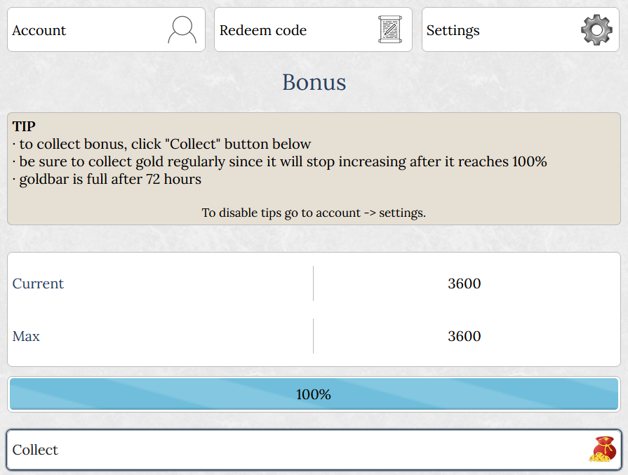 Every hour you get some free gold. Do not forget to collect your daily amount of gold. The bar will