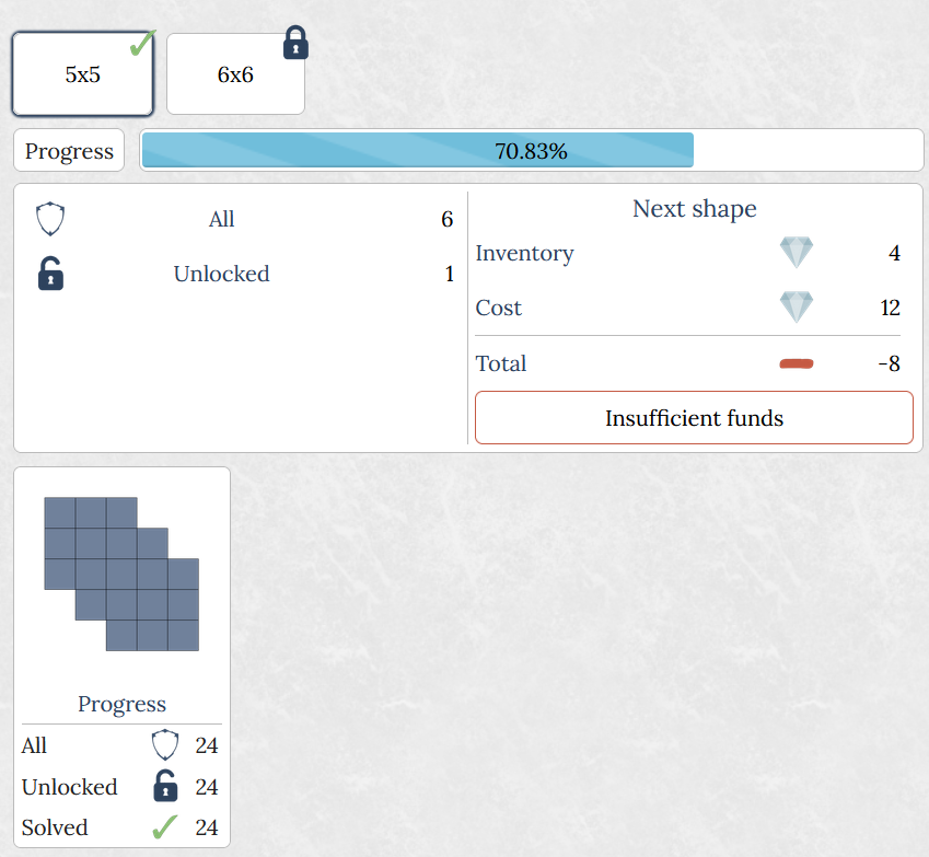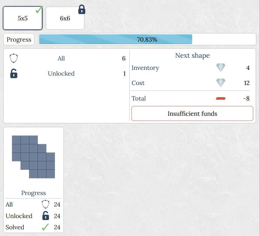 Currently avaliable sizes: 5x5 (6 shapes), 6x6 (2 shapes).