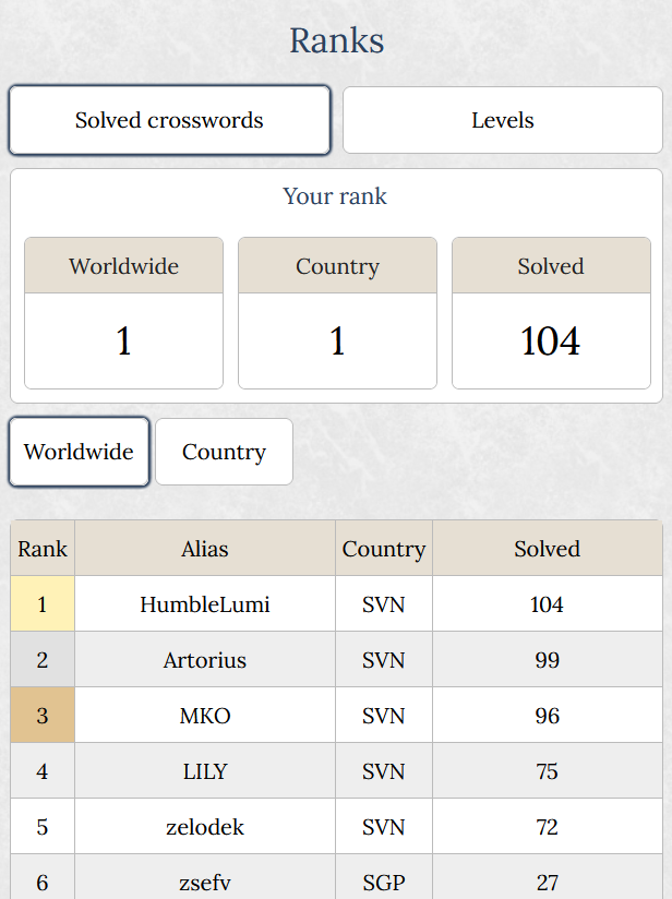 Here you can filter out Unsolved, Paused or Solved crosswords via submenu. At the top you will see some statistics