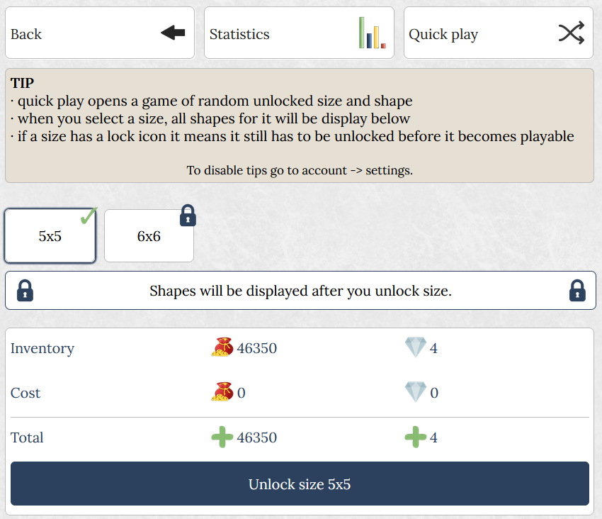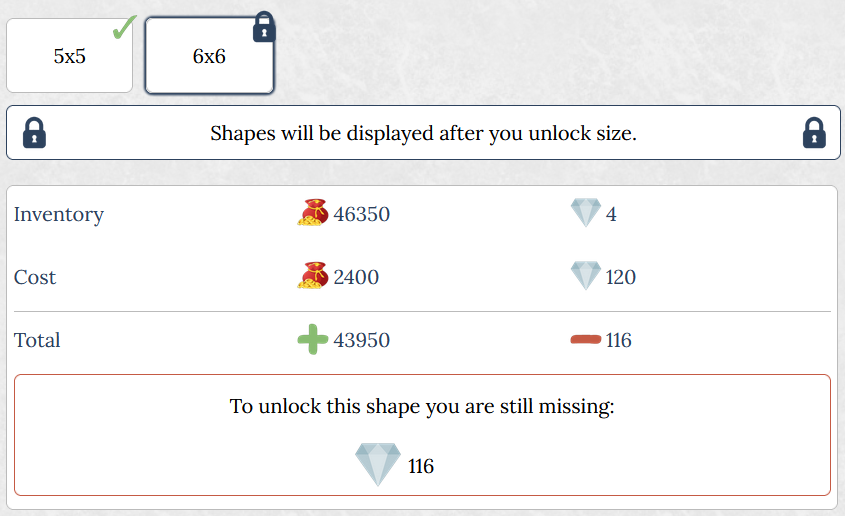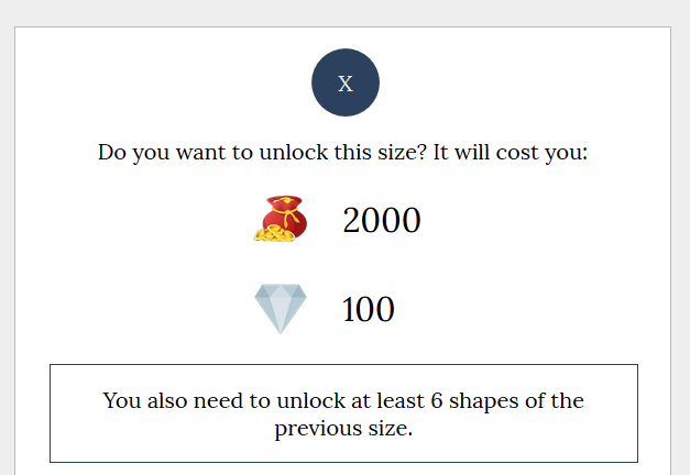 To unlock size you will need Gold, Diamonds and certain ammount of shapes unlocked.